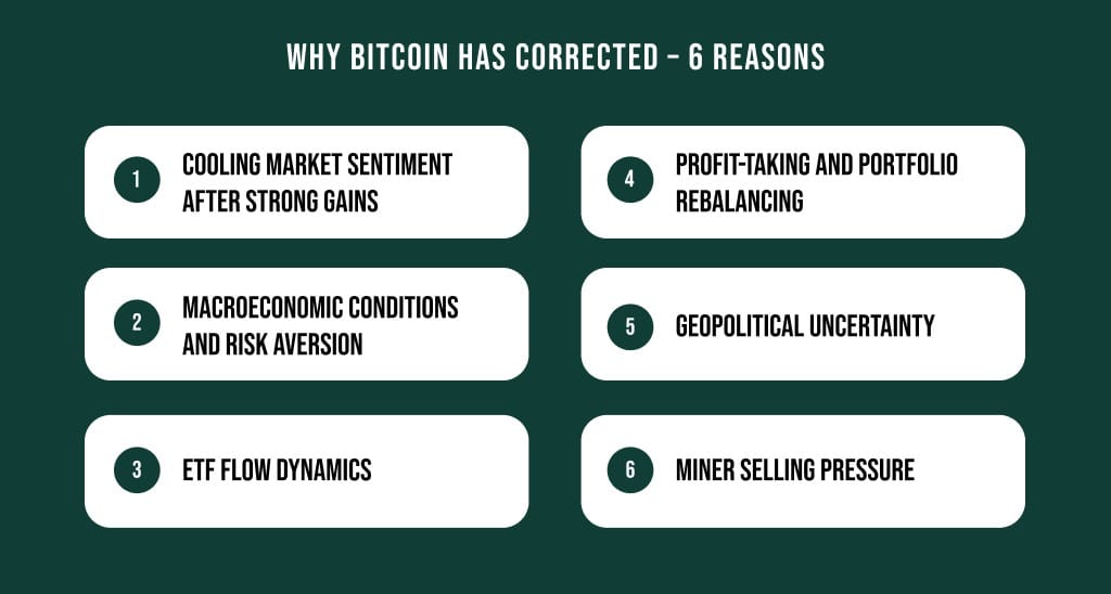 Market corrections have always been part of Bitcoin’s history. Phases of strong price appreciation have repeatedly been followed by pullbacks. The main reasons for a Bitcoin dip have always been changes in liquidity, market sentiment, and investors’ appetite for risk.
